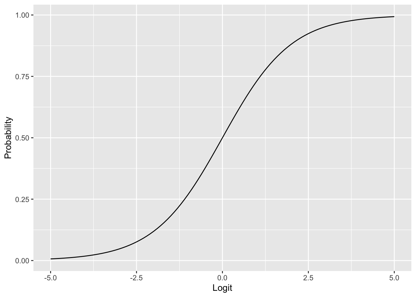 Often it is convenient to work with the logarithm of the odds, known as the logit: \[ \text{logit}(\pi) = \ln \text{Odds} = \ln \left( \frac{\pi}{1 - \pi} \right). \] The logit transformation maps probabilities from the interval \([0, 1]\) to the entire real line: \(\text{logit} \to -\infty\) as \(\pi \to 0\) and \(\text{logit} \to +\infty\) as \(\pi \to 1\). To convert back from logits to probabilities, we use the logistic function (also called the inverse logit): \[ \pi = \frac{1}{1 + e^{-\text{logit}}}. \tag{5.4}\]